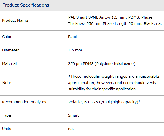 - Smart technology : Smart SPME Fiber에는 매개변수, 범위 및 사용 이력이 포함된 칩이 장착되어 있습니다.